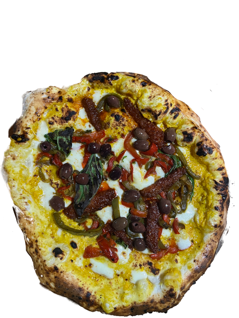 Coulis de poivron jaune - Fior di Latte - Pecorino ‘Nduja* de Porc noir - Poivrons rôtis - Olives taggiasche