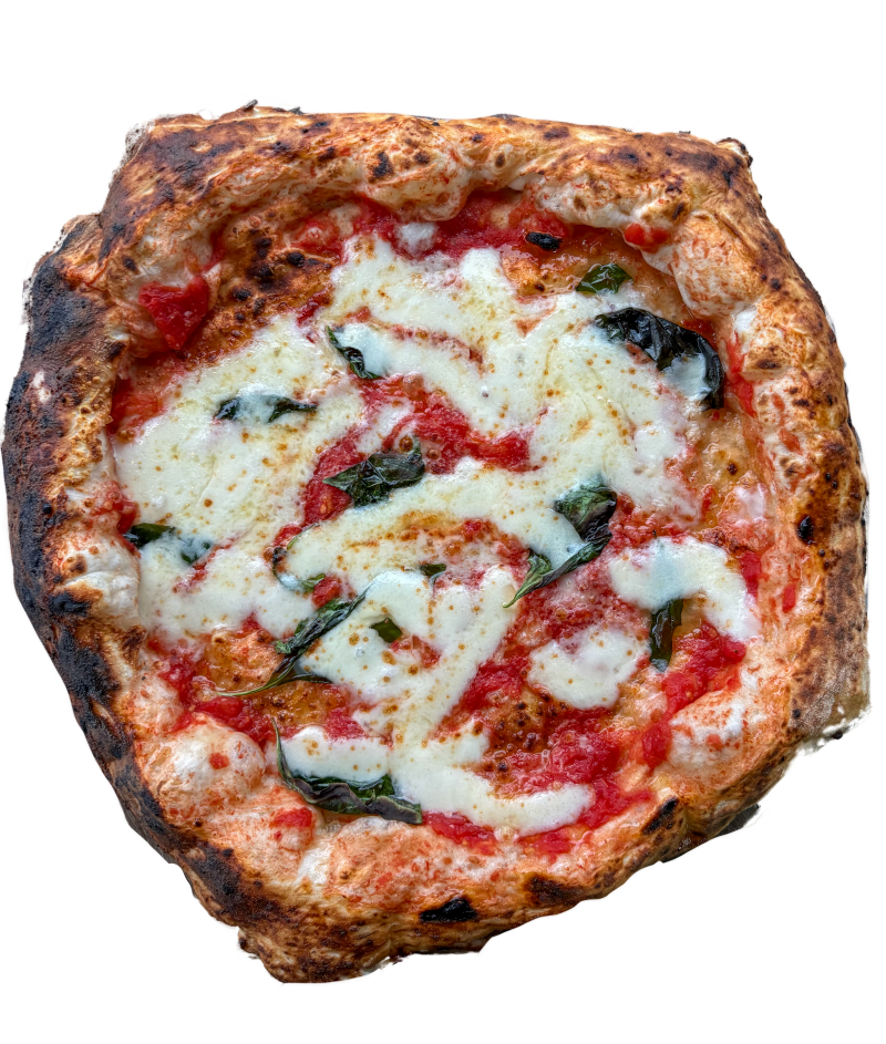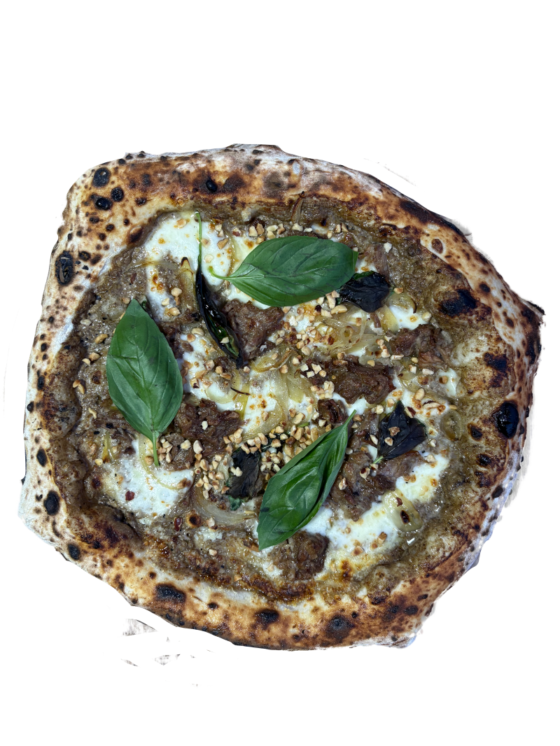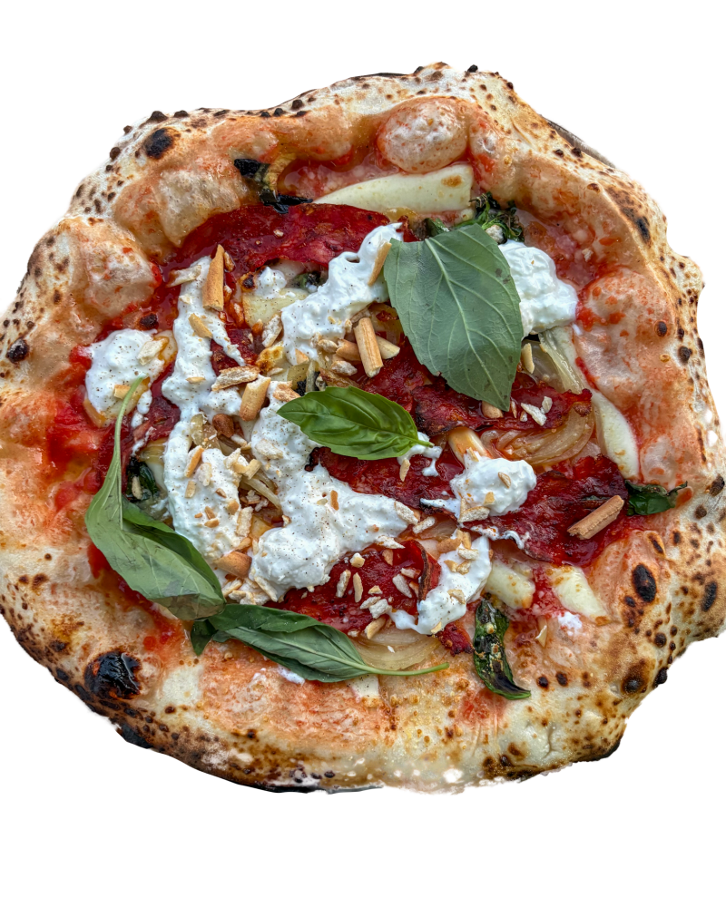 San Marzano DOP - Fior di Latte - Oignons confits - Soppressata calabraise - Stracciatella - Taralli - Basilic